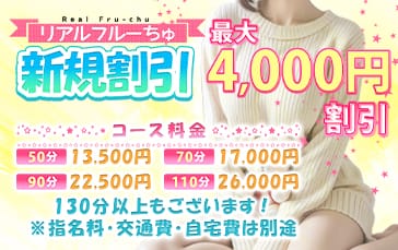 ♡はじめてのフルーちゅ♡ ★ご新規様限定の新規割★ お店初めてのご利用のお客様 →最大 4,000円OFF← 【注意事項】 ※フリーでのご利用は70分コース以上でお願いいたします。 ※交通費、指名料 プレミア料は別途料金 ※他イベント併用不可 ※50分は西船橋限定