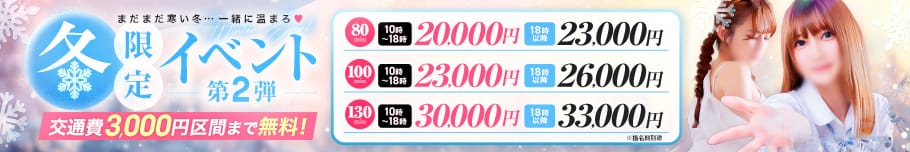 冬限定イベント☆彡80分 10時~18時 ➡ 20,000円18時以降 ➡ 23,000円100分10時~18時 ➡ 23,000円18時以降 ➡ 26,000円130分10時~18時 ➡ 30,000円18時以降 ➡ 33,000円交通費3,000円区間まで無料※差額の交通費を頂くことがあります※指名料別途営業時間:10:00~翌6:00
