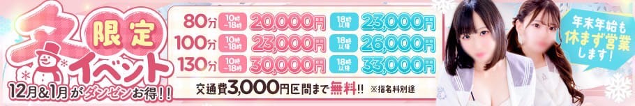 90分24,000円⇒10,000円125分32,000円⇒20,000円※ご利用条件・即ヒメ限定・90分ー125分コース限定(リアルタイム情報はお電話にてご確認下さい。)・交通費/出張費/サービス料/各3項目一律\2,000-・総額より10%-(端数切上)・本指名不可・その他割引併用不可お電話にて「即ヒメ割見た」とお伝えください。