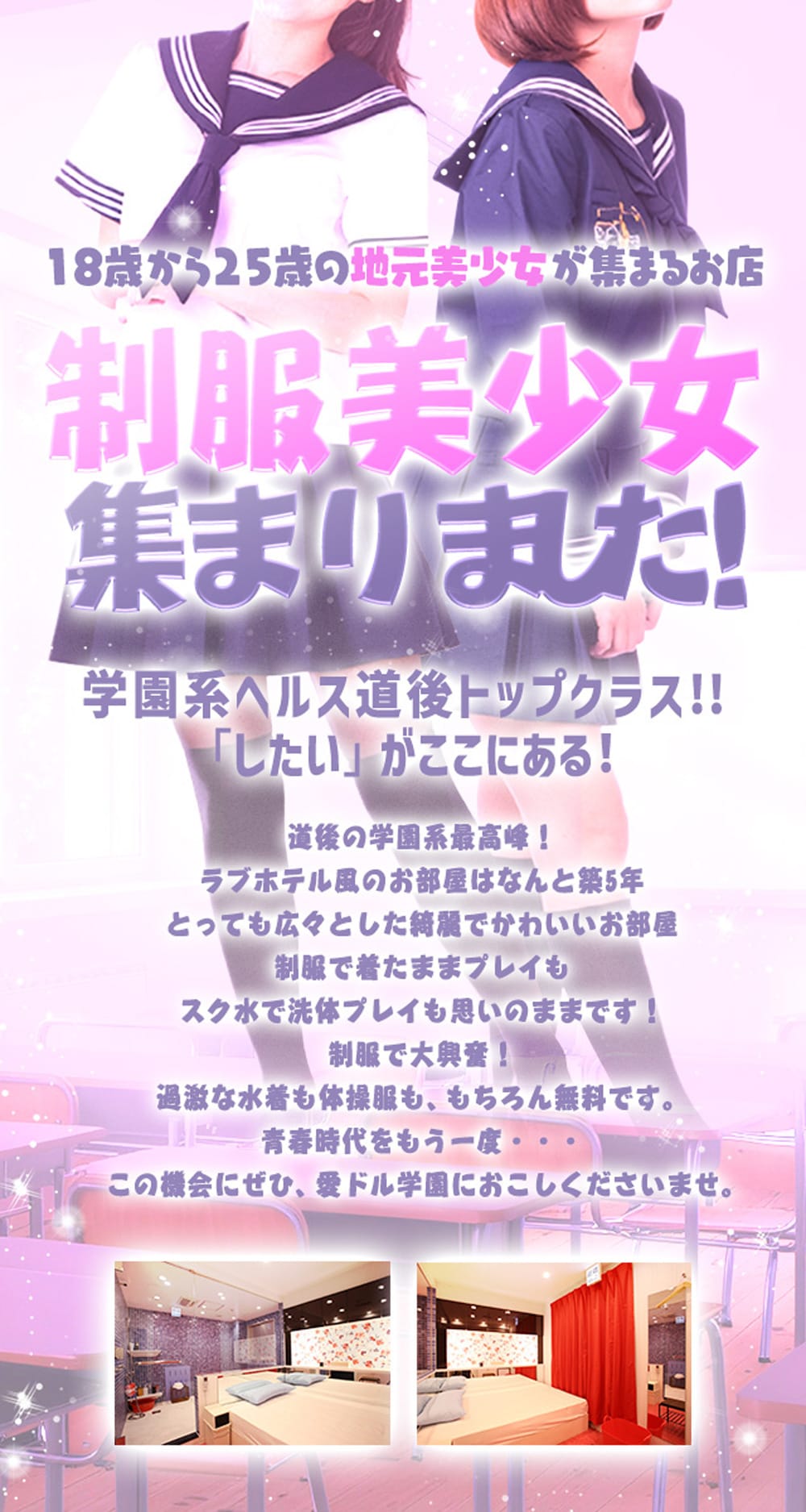 愛媛県の道後温泉エリアにお店を構える【愛ドル学園 ☆制服着たまま部☆】をご紹介!まず女の子たちですが、このお店に在籍をしている女の子の8割り以上が未経験や初心者の女の子なんです!これに学園系のコンセプトが加われば至福以外の何物でもありません!まだまだウブな女の子を是非アナタ色に染めてみてはいかがでしょうか?定期的にイベントを開催したりお得なクーポンの発行などもありますので、最新情報の見逃しなどは厳禁です!
